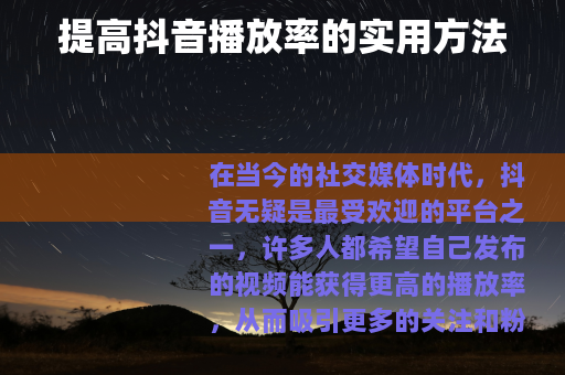 在当今的社交媒体时代,抖音无疑是最受欢迎的平台之一,许多人都希望自己发布的视频能获得更高的播放率,从而吸引更多的关注和粉丝,怎样让抖音播放率提高一点呢?以下是一些实用的方法。 是关键,要确保你的视频内容具有吸引力和独特性,可以从用户的兴趣点出发,比如热门话题、搞笑段子、美食制作、生活小窍门等,当你的内容能够满足用户的某种需求或引起他们的共鸣时,他们就更有可能观看你的视频并分享给他人,如果你擅长烹饪,那么制作一些精美的美食视频,详细展示烹饪过程和独特的配方,会吸引很多美食爱好者的关注。