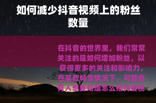 在抖音的世界里,我们常常关注的是如何增加粉丝,以获得更多的关注和影响力,在某些特定情况下,可能会有人想要知道怎么把抖音视频上的粉丝去掉,这可能是因为个人账号定位的改变,或者是希望拥有一个更精准的粉丝群体等原因。