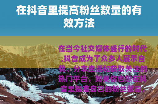 在当今社交媒体盛行的时代,抖音成为了众多人展示自我、分享生活和获取关注的热门平台,如果你也想在抖音里提高自己的粉丝数量,以下是一些实用的方法。