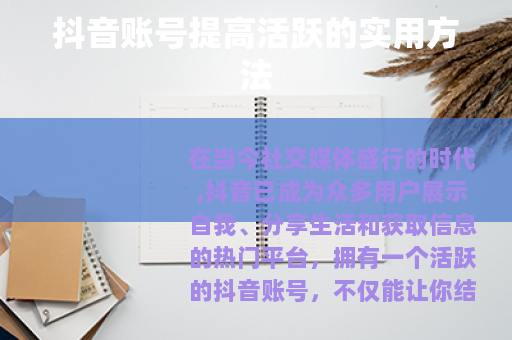 在当今社交媒体盛行的时代,抖音已成为众多用户展示自我、分享生活和获取信息的热门平台,拥有一个活跃的抖音账号,不仅能让你结交更多志同道合的朋友,还能为你带来更多的关注和机会,抖音账号怎么提高活跃呢?以下是一些实用的方法。 创作是关键,确保你的视频内容具有独特性和吸引力,可以从自己的兴趣爱好、专业技能或生活中的趣事入手,制作出能引发观众共鸣的视频,如果你擅长烹饪,那么可以制作一系列精美的美食制作视频,详细展示每一个步骤和独特的烹饪技巧,让观众在观看的过程中既能学到知识,又能感受到美食的魅力,要注意视频的质量,包括画面的清晰度、稳定性以及声音的清晰度等,良好的视频质量能为观众带来更好的观看体验,从而增加他们在你账号上停留的时间。