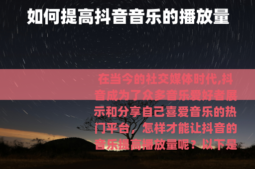 在当今的社交媒体时代,抖音成为了众多音乐爱好者展示和分享自己喜爱音乐的热门平台,怎样才能让抖音的音乐提高播放量呢?以下是一些实用的方法。