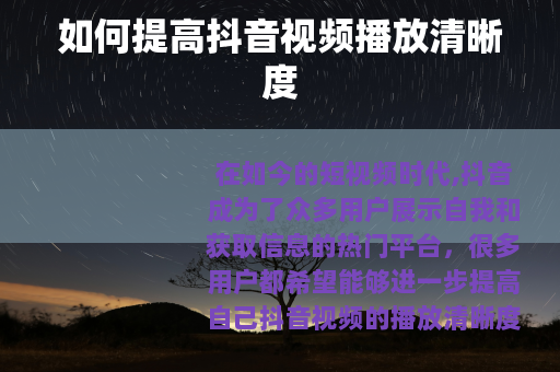 在如今的短视频时代,抖音成为了众多用户展示自我和获取信息的热门平台,很多用户都希望能够进一步提高自己抖音视频的播放清晰度,以给观众带来更好的观看体验,以下是一些可以帮助你提高抖音视频播放清晰度的方法。