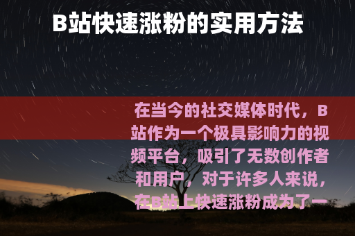 在当今的社交媒体时代,B站作为一个极具影响力的视频平台,吸引了无数创作者和用户,对于许多人来说,在B站上快速涨粉成为了一个重要的目标,以下是一些可以帮助你在B站快速涨粉的有效方法。 质量是关键,要制作出有吸引力、有价值的视频内容,深入了解你的目标受众,知道他们感兴趣的话题和喜好,然后围绕这些来创作视频,如果你发现游戏类内容在B站很受欢迎,而你又擅长某一款游戏,那么就可以制作高质量的游戏攻略、精彩操作集锦或有趣的游戏直播回放等视频,确保你的视频在画面、声音和剪辑上都达到一定的水准,给观众带来良好的观看体验。