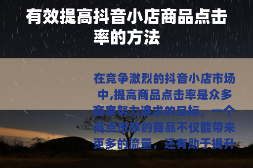 要提高抖音小店商品的点击率,需要从多个方面入手,不断优化商品的各个要素,同时积极利用抖音平台的各种功能和特点,才能在激烈的市场竞争中取得优势,让自己的商品获得更多用户的点击和购买。 对你有所帮助,你可以根据实际情况对文章进行调整和完善,如果你还有其他问题,欢迎继续向我提问。