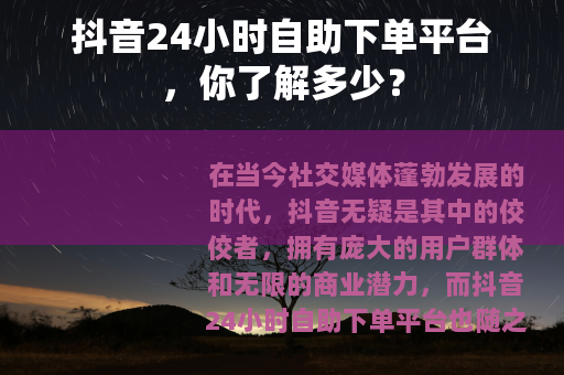 在当今社交媒体蓬勃发展的时代,抖音无疑是其中的佼佼者,拥有庞大的用户群体和无限的商业潜力,而抖音24小时自助下单平台也随之应运而生,为众多用户提供了便利的服务。