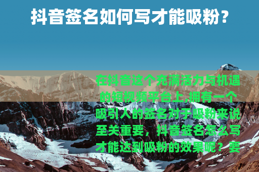 在抖音这个充满活力与机遇的短视频平台上,拥有一个吸引人的签名对于吸粉来说至关重要,抖音签名怎么写才能达到吸粉的效果呢?