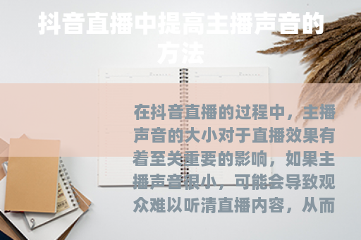 通过以上这些方法的综合运用,相信能够很好地解决抖音直播中主播声音小的问题,让主播在直播时能够以清晰、洪亮的声音与观众进行交流,为观众带来更好的直播体验,从而提升直播的质量和影响力。