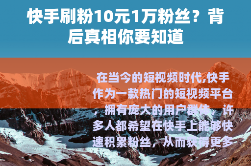 在当今的短视频时代,快手作为一款热门的短视频平台,拥有庞大的用户群体,许多人都希望在快手上能够快速积累粉丝,从而获得更多的关注和机会,而“快手刷粉10元1万粉丝”这样的信息也随之在一些角落出现,吸引着不少人的目光。