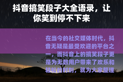 在当今的社交媒体时代,抖音无疑是最受欢迎的平台之一,而抖音上的搞笑段子更是为无数用户带来了欢乐和轻松的时刻,就为大家整理了一份抖音搞笑段子大全语录,让你随时随地都能开怀大笑。
