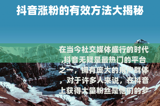 在当今社交媒体盛行的时代,抖音无疑是最热门的平台之一,拥有庞大的用户群体,对于许多人来说,在抖音上获得大量粉丝是他们的梦想,因为这不仅能带来知名度,还可能创造各种商业机会,下面就为大家介绍一些抖音涨粉的实用方法。