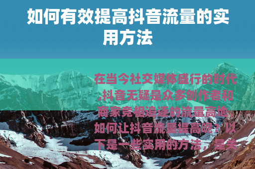 在当今社交媒体盛行的时代,抖音无疑是众多创作者和商家竞相追逐的流量高地,如何让抖音流量提高呢?以下是一些实用的方法。 是关键,抖音用户的口味日益挑剔,只有提供真正有价值、有趣、有创意的内容,才能吸引他们的关注并停留,无论是搞笑段子、美食制作、知识科普还是生活小窍门,都要确保内容的独特性和新颖性,如果你擅长烹饪,可以拍摄详细的美食制作过程,展示独特的烹饪技巧和创意食谱,让观众在观看中不仅能学到东西,还能感受到美食的魅力,从而增加点赞、评论和分享的可能性,进而提高流量。
