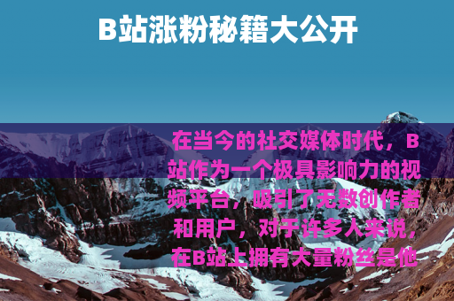 在当今的社交媒体时代,B站作为一个极具影响力的视频平台,吸引了无数创作者和用户,对于许多人来说,在B站上拥有大量粉丝是他们的梦想,那么B站怎么涨粉丝呢?以下是一些实用的方法。 质量是关键,要确保你的视频内容有独特性和吸引力,无论是搞笑、知识科普、游戏攻略还是生活趣事,都要做到精益求精,让观众在观看你的视频后能获得价值,比如学到新知识、得到快乐或者产生情感共鸣,这样观众才会愿意关注你,期待你更多的作品。