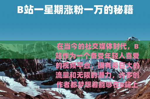 在当今的社交媒体时代,B站作为一个备受年轻人喜爱的视频平台,拥有着巨大的流量和无限的潜力,许多创作者都梦想着能够在B站上快速涨粉,实现自己的创作价值和影响力,我们就来分享一些在B站一星期涨粉一万的实用方法。 质量是关键,要想吸引观众并让他们成为你的粉丝,你必须提供有价值、有趣、有创意的视频内容,无论是搞笑、知识科普、美食制作还是游戏攻略等各种类型,都要确保你的视频能够在众多同类作品中脱颖而出,在制作视频时,要注重画面的清晰度和稳定性,以及声音的质量,给观众带来良好的视听体验。