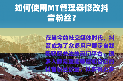 MT管理器是一款功能强大的文件管理工具,它可以帮助用户对手机中的各类文件进行管理和编辑,要使用MT管理器修改抖音粉丝,首先需要在手机上安装好MT管理器应用程序,安装完成后,打开MT管理器,找到抖音应用在手机中的安装目录。