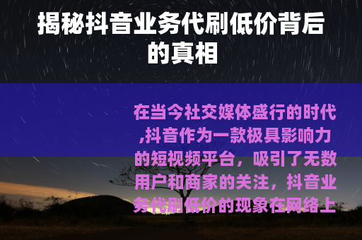 在当今社交媒体盛行的时代,抖音作为一款极具影响力的短视频平台,吸引了无数用户和商家的关注,抖音业务代刷低价的现象在网络上悄然兴起,许多人对此充满了好奇,想知道这背后究竟是怎样的一种情况。