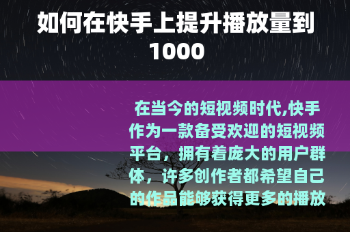 通过以上这些方法的综合运用,相信你在快手上提升播放量到1000并不是一件难事,只要坚持努力,不断优化自己的创作和运营策略,就一定能够在快手上取得更好的成绩,让自己的作品被更多的人所喜爱。