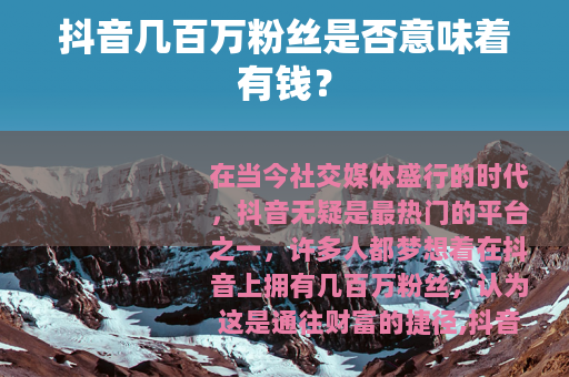 在当今社交媒体盛行的时代,抖音无疑是最热门的平台之一,许多人都梦想着在抖音上拥有几百万粉丝,认为这是通往财富的捷径,抖音几百万粉丝真的就意味着有钱吗?
