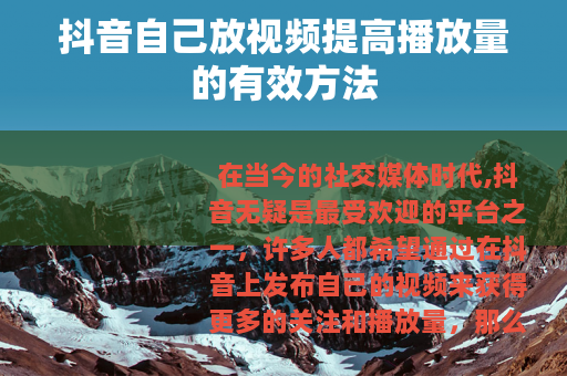 在当今的社交媒体时代,抖音无疑是最受欢迎的平台之一,许多人都希望通过在抖音上发布自己的视频来获得更多的关注和播放量,那么究竟该如何提高抖音自己放视频的播放量呢?以下是一些实用的方法。 是关键,要确保你的视频内容具有吸引力和独特性,可以从自己的兴趣爱好、专业技能或者生活中的有趣经历出发,制作出能够引起观众共鸣的视频,如果你擅长烹饪,那么可以制作一系列精美的美食制作视频,详细展示每一个步骤和独特的烹饪技巧,这样的内容很容易吸引到美食爱好者的关注。