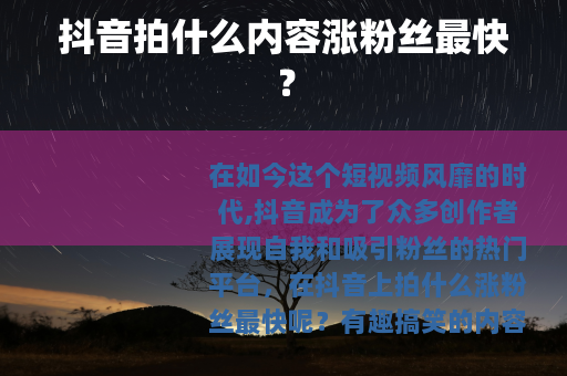 在如今这个短视频风靡的时代,抖音成为了众多创作者展现自我和吸引粉丝的热门平台,在抖音上拍什么涨粉丝最快呢?