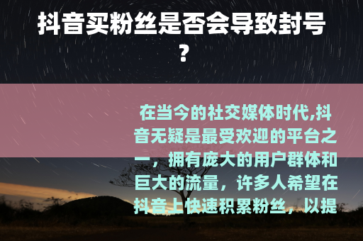 在当今的社交媒体时代,抖音无疑是最受欢迎的平台之一,拥有庞大的用户群体和巨大的流量,许多人希望在抖音上快速积累粉丝,以提高自己的知名度和影响力,从而获得更多的机会和收益,一个问题就应运而生:抖音买粉丝会不会封号呢?