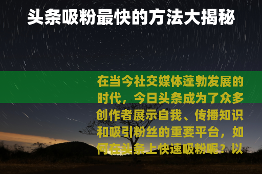 在当今社交媒体蓬勃发展的时代,今日头条成为了众多创作者展示自我、传播知识和吸引粉丝的重要平台,如何在头条上快速吸粉呢?以下为你详细介绍一些行之有效的方法。