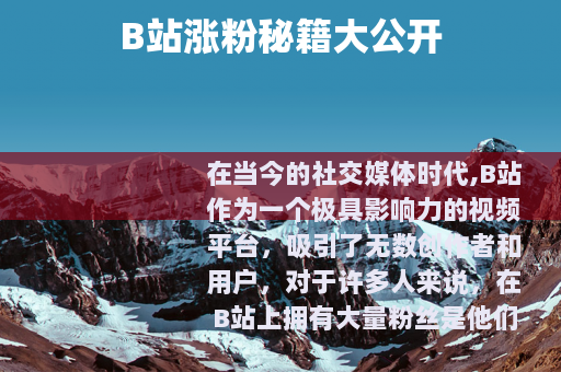 在当今的社交媒体时代,B站作为一个极具影响力的视频平台,吸引了无数创作者和用户,对于许多人来说,在B站上拥有大量粉丝是他们的梦想,B站如何涨粉丝呢?以下是一些实用的方法。 质量是关键,要制作出有创意、有趣且有价值的视频,无论是搞笑、知识科普、美食制作还是游戏攻略等各种类型,都要确保你的视频能够在众多同类内容中脱颖而出,精心策划视频的主题和情节,投入足够的时间和精力去拍摄和剪辑,让观众在观看你的视频时能够获得良好的体验,这样他们才会愿意关注你,成为你的粉丝。