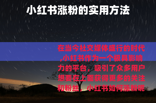 在当今社交媒体盛行的时代,小红书作为一个极具影响力的平台,吸引了众多用户想要在上面获得更多的关注和粉丝,小红书如何涨粉呢?以下是一些有效的方法。