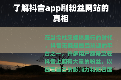 在当今社交媒体盛行的时代,抖音无疑是最受欢迎的平台之一,许多用户都希望在抖音上拥有大量的粉丝,以提高自己的影响力和知名度,这也使得一些所谓的抖音app刷粉丝网站应运而生。