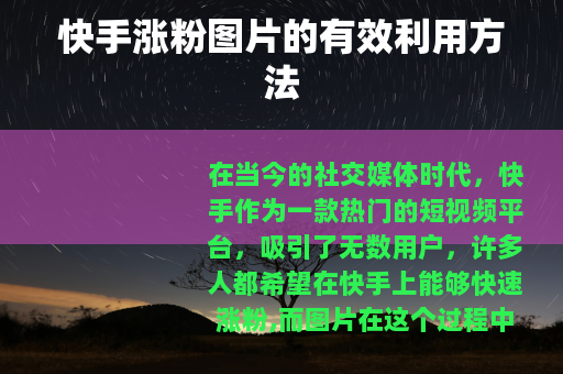 在当今的社交媒体时代,快手作为一款热门的短视频平台,吸引了无数用户,许多人都希望在快手上能够快速涨粉,而图片在这个过程中可以发挥重要的作用。