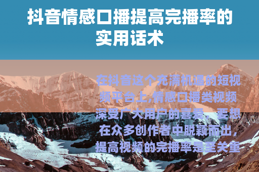 在抖音这个充满机遇的短视频平台上,情感口播类视频深受广大用户的喜爱,要想在众多创作者中脱颖而出,提高视频的完播率是至关重要的,我们就来分享一些实用的抖音情感口播提高完播率的话术技巧,帮助你打造更具吸引力的情感口播内容。