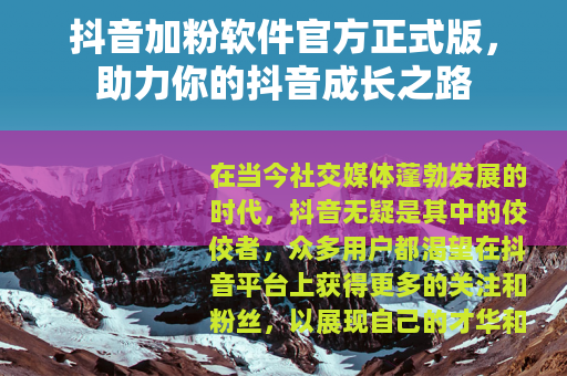 在当今社交媒体蓬勃发展的时代,抖音无疑是其中的佼佼者,众多用户都渴望在抖音平台上获得更多的关注和粉丝,以展现自己的才华和个性,而抖音加粉软件官方正式版的出现,为用户们提供了一个有效的途径来提升自己的粉丝数量。