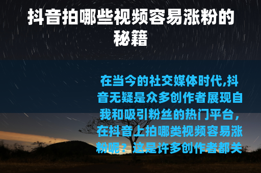 在当今的社交媒体时代,抖音无疑是众多创作者展现自我和吸引粉丝的热门平台,在抖音上拍哪类视频容易涨粉呢?这是许多创作者都关心的问题。