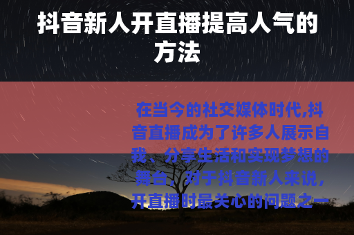 在当今的社交媒体时代,抖音直播成为了许多人展示自我、分享生活和实现梦想的舞台,对于抖音新人来说,开直播时最关心的问题之一就是如何提高人气,以下是一些实用的方法,可以帮助抖音新人在直播中吸引更多观众,提升人气。