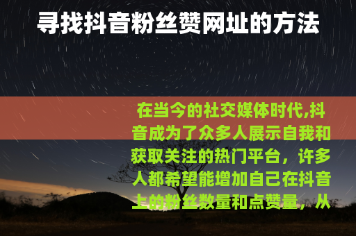 需要明确的是,并不存在一个固定的、官方认可的所谓“抖音粉丝赞的网址”,一些声称可以提供大量粉丝和赞的网址往往存在诸多问题,这些非正规途径可能会导致账号被封禁或受到其他处罚,严重影响用户在抖音平台的正常使用。