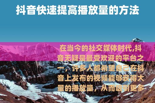 在当今的社交媒体时代,抖音无疑是最受欢迎的平台之一,许多人都希望自己在抖音上发布的视频能够获得大量的播放量,从而吸引更多的关注和粉丝,抖音怎样才能快速提高播放数量呢?以下是一些有效的方法。 是关键,要确保你的视频内容具有吸引力和独特性,可以从热门话题中寻找灵感,但也要加入自己的创意和特色,让观众在众多相似的视频中能够一眼注意到你的作品,如果你擅长烹饪,那么可以制作一些独特的美食制作视频,展示一些不常见的食谱或独特的烹饪技巧,这样更容易引起观众的兴趣。