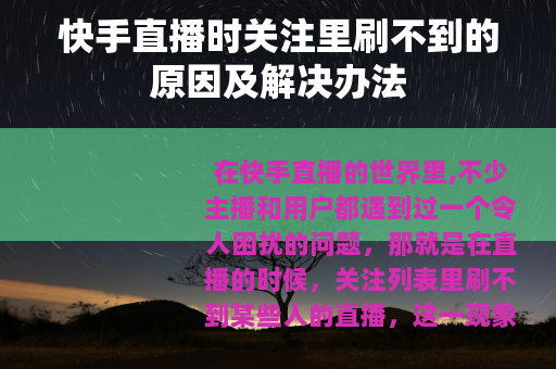 在快手直播的世界里,不少主播和用户都遇到过一个令人困扰的问题,那就是在直播的时候,关注列表里刷不到某些人的直播,这一现象引发了众多人的疑惑和不满,今天我们就来深入探讨一下其中的缘由以及相应的解决方法。