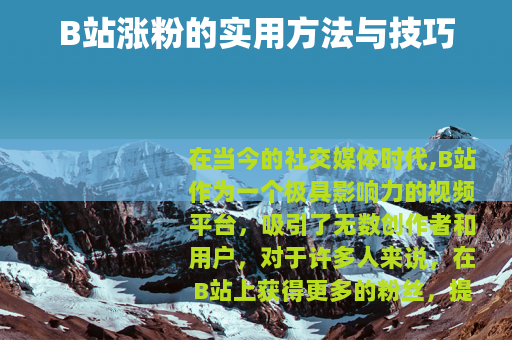 在当今的社交媒体时代,B站作为一个极具影响力的视频平台,吸引了无数创作者和用户,对于许多人来说,在B站上获得更多的粉丝,提升自己的影响力,是一个非常重要的目标,B站怎么涨粉呢?以下是一些实用的方法和技巧。 质量是关键,要制作出高质量、有吸引力的视频内容,这意味着你需要有一个明确的主题,并且在这个主题上能够提供独特的见解、有趣的故事或者实用的知识,如果你擅长游戏,那么可以制作精彩的游戏攻略、搞笑的游戏实况或者深入的游戏评测视频,要注重视频的制作水平,包括画面的清晰度、剪辑的流畅性以及音频的质量等,一个制作精良的视频能够给观众留下更好的印象,从而增加他们关注你的可能性。