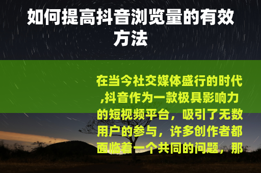 提高抖音浏览量需要从多个方面入手,不断优化和改进自己的创作策略和方法,只要坚持不懈地努力,相信你的抖音浏览量一定会逐步提升,在这个充满机遇的平台上收获更多的关注和认可。