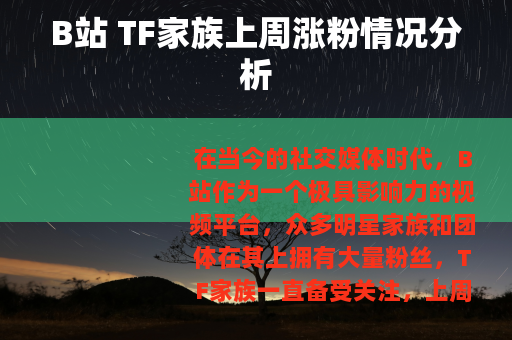 在当今的社交媒体时代,B站作为一个极具影响力的视频平台,众多明星家族和团体在其上拥有大量粉丝,TF家族一直备受关注,上周,TF家族在B站的涨粉情况引起了不少人的注意。
