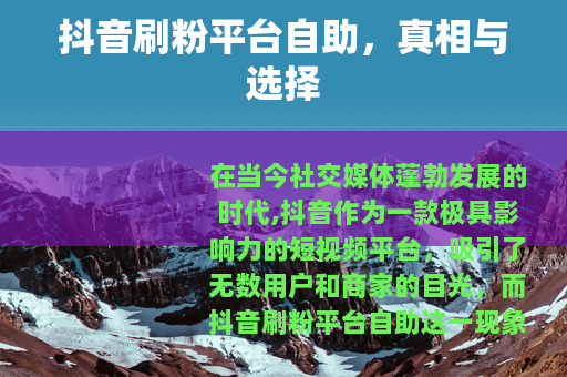 在当今社交媒体蓬勃发展的时代,抖音作为一款极具影响力的短视频平台,吸引了无数用户和商家的目光,而抖音刷粉平台自助这一现象也随之兴起,引发了众多人的关注和讨论。