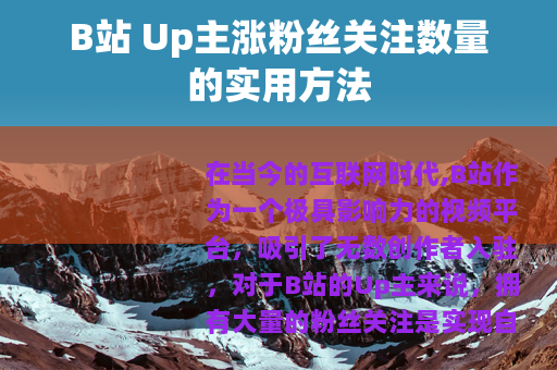 在当今的互联网时代,B站作为一个极具影响力的视频平台,吸引了无数创作者入驻,对于B站的Up主来说,拥有大量的粉丝关注是实现自身价值和创作目标的重要基础,B站 Up主究竟怎么样才能有效涨粉丝关注数量呢?以下是一些实用的方法。 质量是关键,要制作出高质量、有吸引力的视频内容,这意味着在选题上要独具匠心,找到目标受众感兴趣的话题,如果你擅长游戏领域,那么可以选择一些热门游戏的攻略、技巧分享,或者对新游戏的评测等,在视频制作过程中,要注重画面的清晰流畅、剪辑的节奏感以及声音的清晰无杂音等,为观众带来良好的观看体验。
