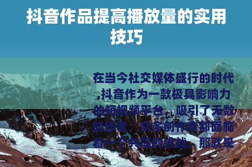 提高抖音作品的播放量需要从多个方面入手,不断优化视频内容、提升制作技巧,并注重账号的运营和推广,只有持续努力和创新,才能在竞争激烈的抖音平台上获得更多的关注和认可,让自己的作品得到更广泛的传播。