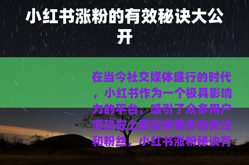 在当今社交媒体盛行的时代,小红书作为一个极具影响力的平台,吸引了众多用户渴望在上面获得更多的关注和粉丝,小红书涨粉秘诀有哪些呢?下面就为大家详细介绍。 的质量是关键,要确保你发布的笔记内容有价值、有趣且独特,可以分享自己的专业知识、生活经验、购物心得、旅行攻略等等,如果你擅长美妆,那么可以发布详细的化妆教程、产品评测等内容,让用户能够从你的笔记中真正学到有用的东西,这样他们就更有可能关注你,期待你后续的分享。