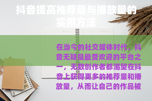 在当今的社交媒体时代,抖音无疑是最受欢迎的平台之一,无数创作者都渴望在抖音上获得更多的推荐量和播放量,从而让自己的作品被更多人看到,实现自己的创作价值,抖音如何提高推荐量与播放量数量呢?以下是一些实用的方法。 质量是关键,要确保你的视频内容具有独特性、趣味性和实用性,独特的内容能够吸引用户的好奇心,让他们想要点击观看,有趣的视频可以让观众在观看过程中产生愉悦的情绪,从而更愿意分享和点赞,而实用性强的内容则能满足用户的某种需求,比如知识技能的学习、生活问题的解决等,如果你擅长烹饪,那么可以制作一些详细的美食制作教程,从食材准备到烹饪步骤,再到最后的成品展示,每一个环节都清晰明了,这样的视频对于那些想要学习烹饪的用户来说就非常有价值。