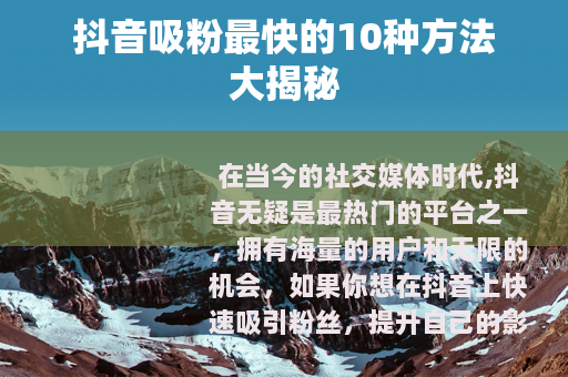 在当今的社交媒体时代,抖音无疑是最热门的平台之一,拥有海量的用户和无限的机会,如果你想在抖音上快速吸引粉丝,提升自己的影响力,那么以下这10种方法或许能助你一臂之力。