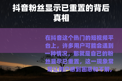在抖音这个热门的短视频平台上,许多用户可能会遇到一种情况,那就是自己的粉丝显示已重置,这一现象常常让用户感到困惑和不解,今天我们就来深入了解一下抖音粉丝显示已重置到底是怎么回事。