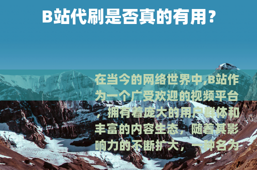 在当今的网络世界中,B站作为一个广受欢迎的视频平台,拥有着庞大的用户群体和丰富的内容生态,随着其影响力的不断扩大,一种名为B站代刷的现象也逐渐进入了人们的视野,B站代刷到底有用吗?这是一个值得深入探讨的问题。
