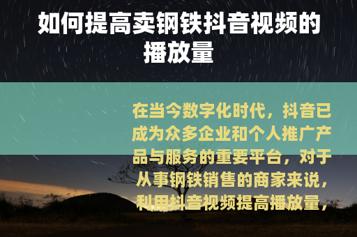 通过以上这些方法的综合运用,卖钢铁的抖音视频就有更大的机会提高播放量,在抖音平台上获得更多的关注和商机,助力钢铁销售业务的发展。