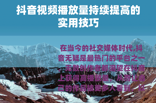在当今的社交媒体时代,抖音无疑是最热门的平台之一,无数创作者都渴望在抖音上获得高播放量,从而让自己的作品被更多人看到,以下是一些能帮助你实现抖音视频播放量持续提高的技巧。 质量是关键,要确保你的视频具有独特性和吸引力,能够在海量的视频中脱颖而出,深入了解你的目标受众,制作出符合他们兴趣和需求的内容,无论是搞笑、美食、时尚还是知识分享等各种领域,都要在内容上做到精益求精,给观众带来真正的价值和乐趣。