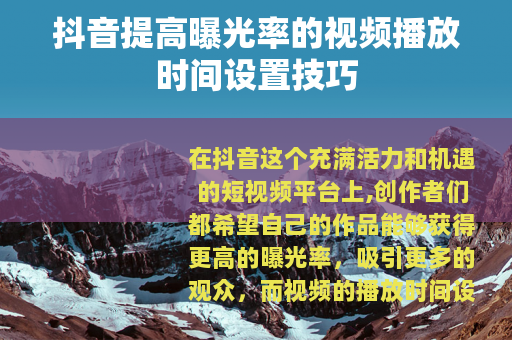 在抖音上设置合适的视频播放时间,需要综合考虑用户的观看习惯、视频内容的特点以及平台的算法规则等多方面因素,只有找到最佳的平衡点,才能制作出既受用户喜爱又能获得高曝光率的抖音视频。